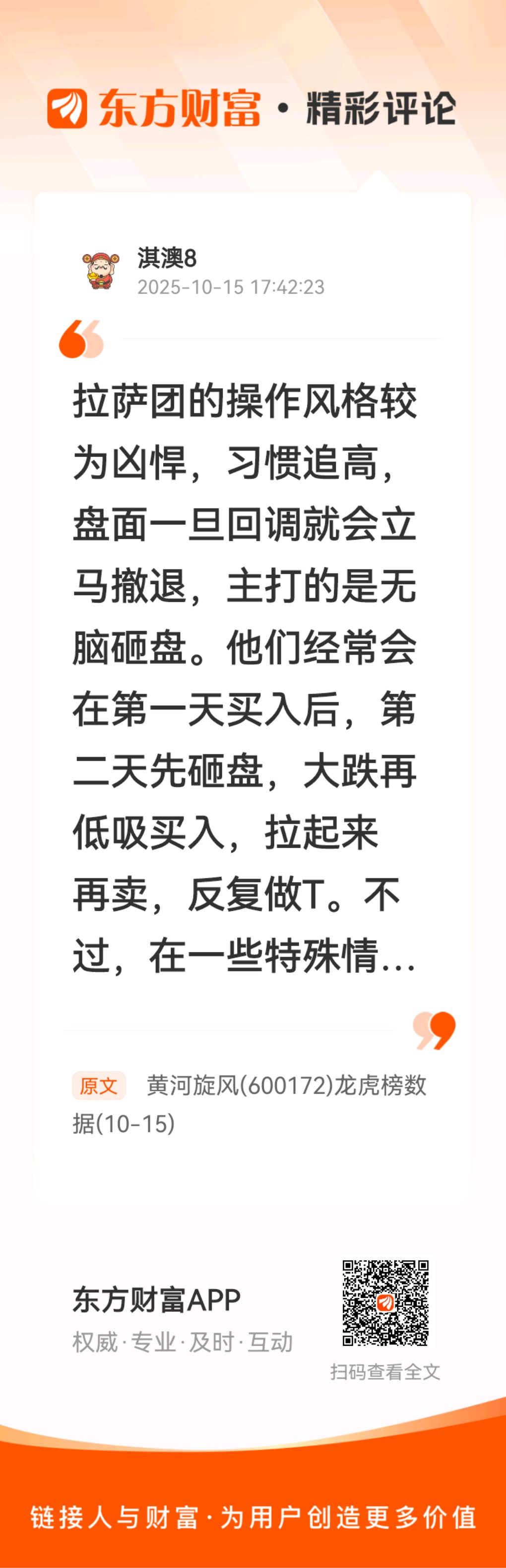 //@淇澳8 :拉萨团的操作风格较为凶悍,习惯追高,盘面一旦回调就会立马撤退,主打的是无脑砸盘。他们经常会在第一天买入后,第二天先砸盘,大跌再低吸买入,拉起来再卖,反复做T。不过,在一些特殊情况下,如个股有重大利好消息刺激,或者市场整体情绪非常高涨时,拉萨团席位也可能会出现反包的情况,但这种情况相对较少。