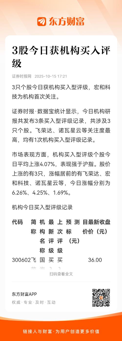 3只个股今日获机构买入型评级,宏和科技为机构首次关注。