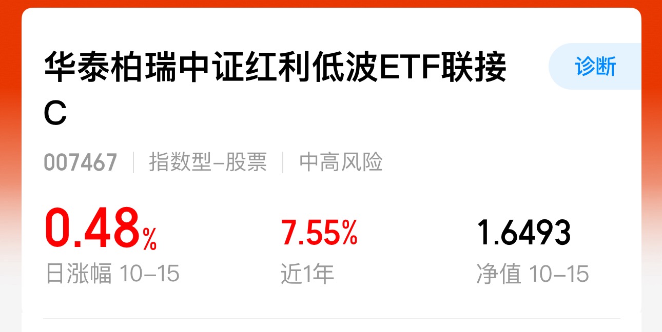 市场又在震荡了,还好配置了华泰中证红利。今天又涨了0.48%,连续五天收红,在这种行情下真是难得的稳健,防御属性确实强。