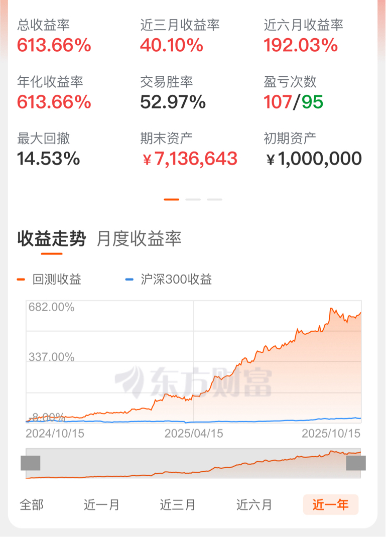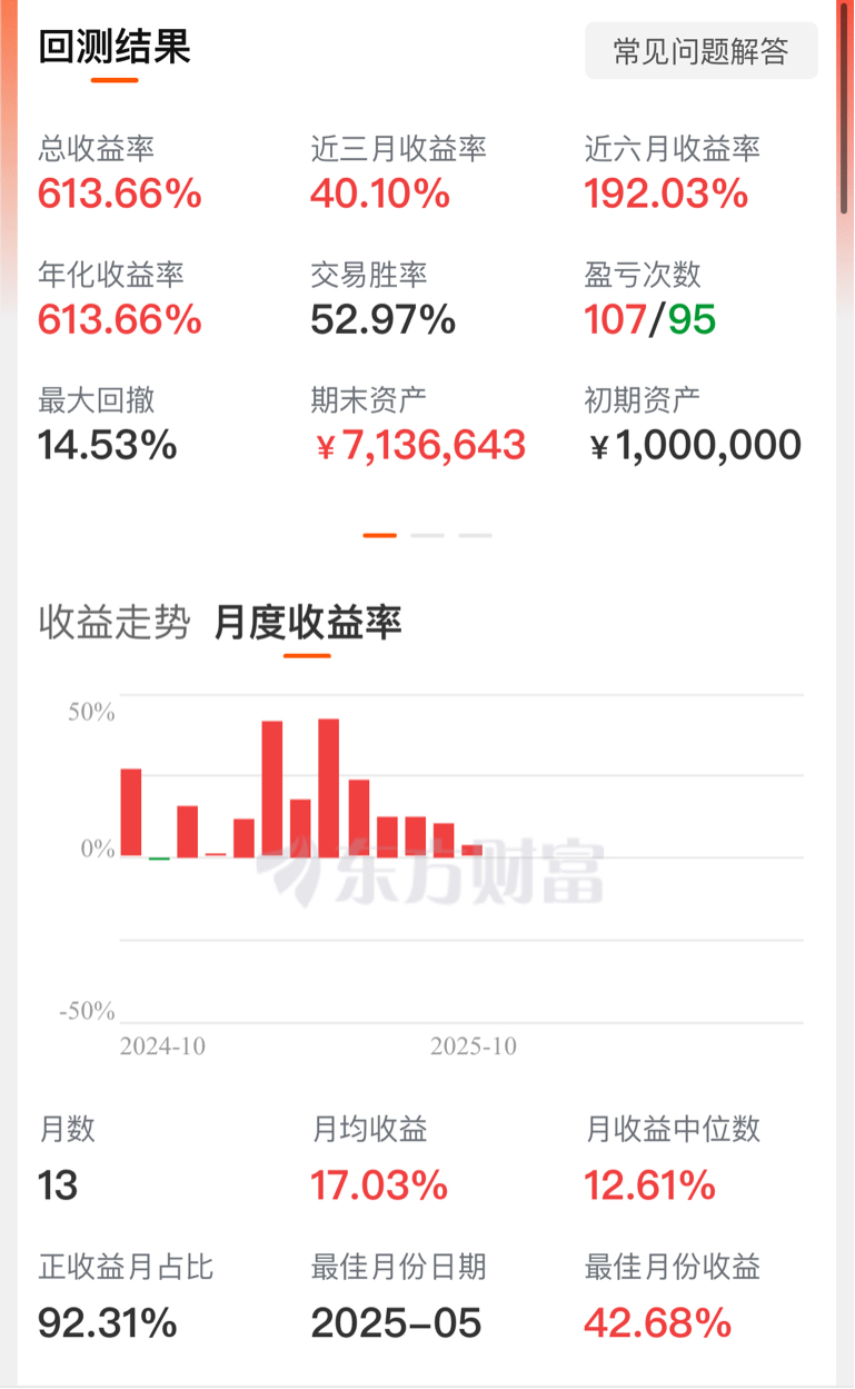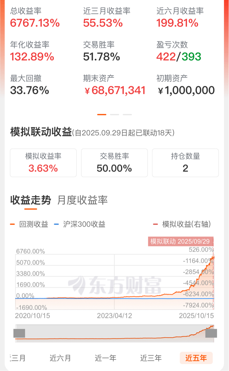 原100倍策略优化产出的一个能保留的策略,更适合流动性好的行情,目测1.5万亿以上的牛市行情收益更好,这个还没实盘,只开了模拟观察,无过拟合,持仓2天,一天一只票,上限三只全覆盖,测六只上限每天二只的收益会低些,但是曲线基本一致,一年收益率6倍,但是五年没有100倍策略高,底层逻辑一样,方向上的优化,该策略需要全权限含北交和科创板,更吃流动性带来的收益。