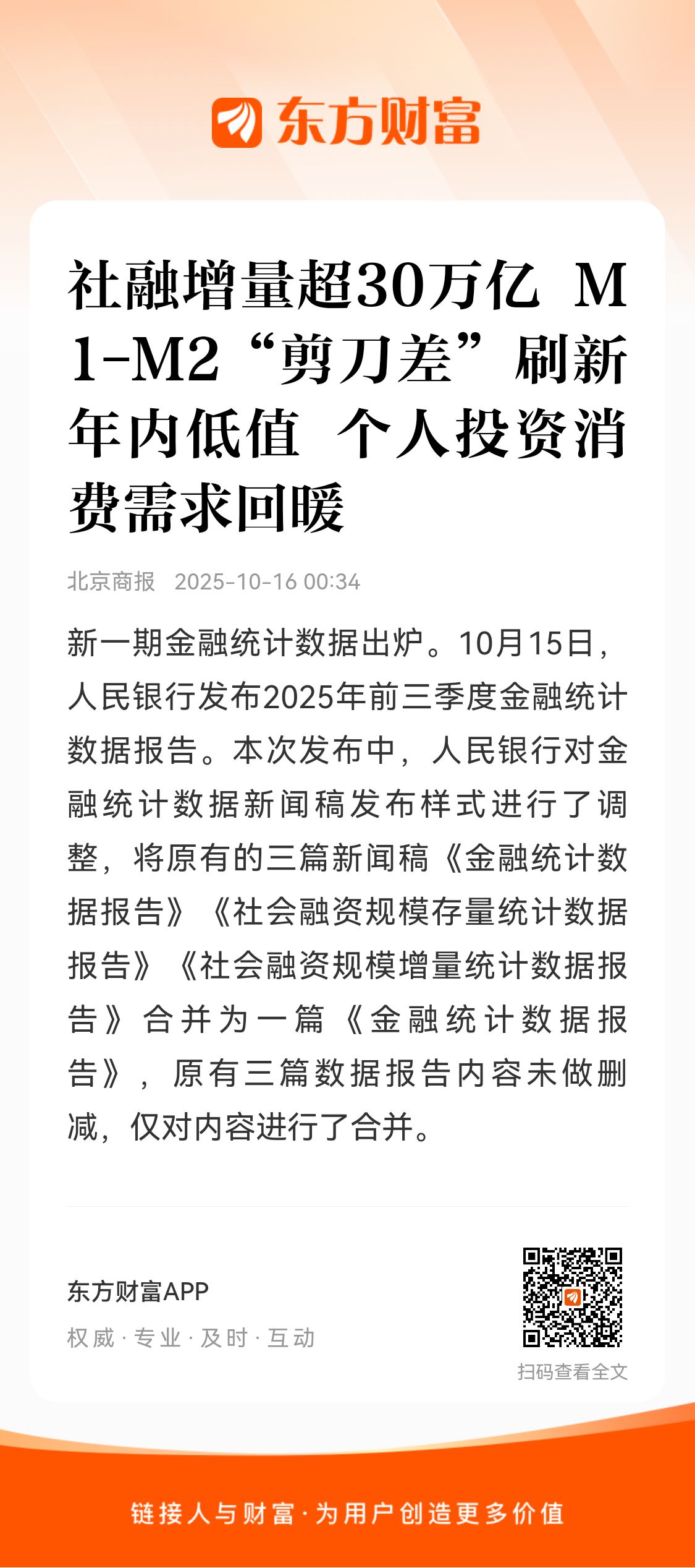 温彬同样提到,M1、M2“剪刀差”收敛,表明更多资金转化为活期存款,有助于消费、投资等经济活动。