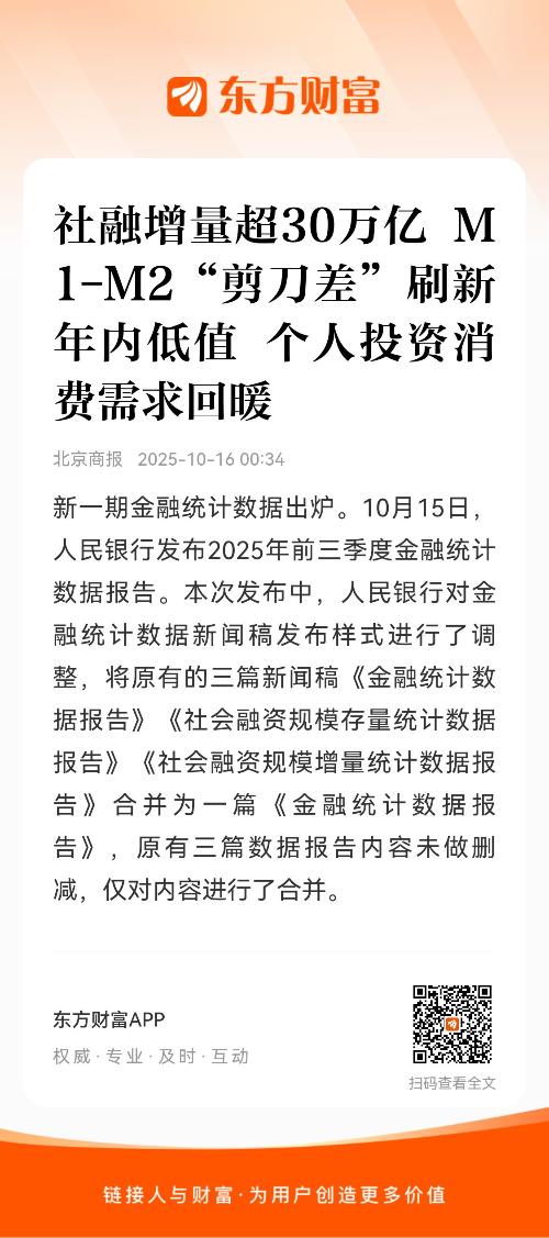 新一期金融统计数据出炉。10月15日,人民银行发布2025年前三季度金融统计数据报告。本次发布中,人民银行对金融统计数据新闻稿发布样式进行了调整,将原有的三篇新闻稿《金融统计数据报告》《社会融资规模存量统计数据报告》《社会融资规模增量统计数据报告》合并为一篇《金融统计数据报告》,原有三篇数据报告内容未做删减,仅对内容进行了合并。