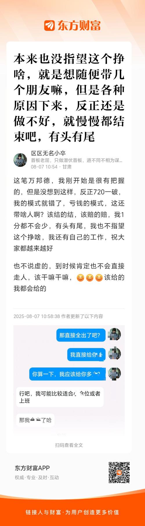 这笔万邦德,我刚开始是很有把握的,但是没想到这样,反正720一破,我的模式就错了,亏钱的模式,这还带啥人啊?该结的结,该赔的赔,我1分都不会少,有头有尾,我也不指望这个挣啥,我还有自己的工作,祝大家都越来越好