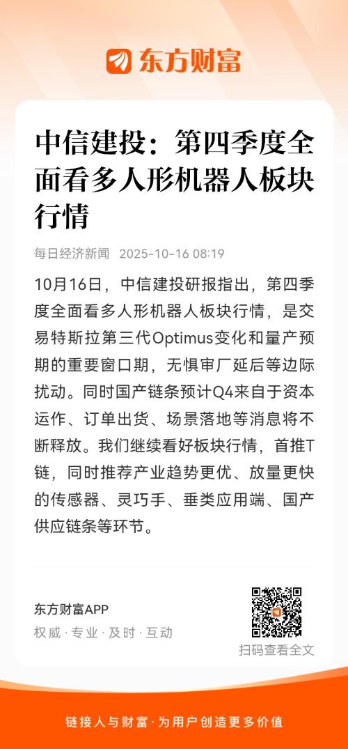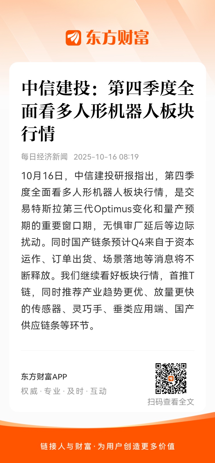 10月16日,中信建投研报指出,第四季度全面看多人形机器人板块行情,是交易特斯拉第三代Optimus变化和量产预期的重要窗口期,无惧审厂延后等边际扰动。同时国产链条预计Q4来自于资本运作、订单出货、场景落地等消息将不断释放。我们继续看好板块行情,首推T链,同时推荐产业趋势更优、放量更快的传感器、灵巧手、垂类应用端、国产供应链条等环节。