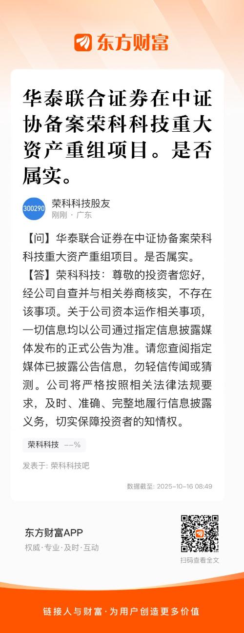 华泰联合证券在中证协备案荣科科技重大资产重组项目。是否属实。