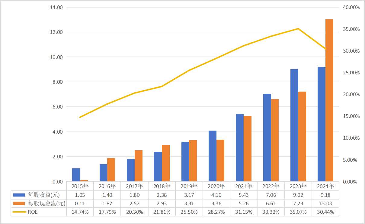 1、每股收益增速非常亮眼,总增速达到了774.29%,不过在20~23年,老窖连续四年每股现金流都要弱于每股收益,好在24年现金流大幅增长算是填补了窟窿;