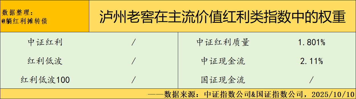 最后再补一张老窖在主流价值红利指数中的权重数据汇总: