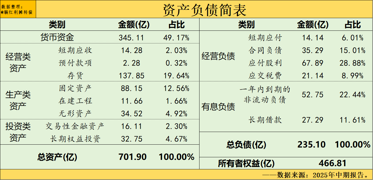 过去十年,老窖的资产负债表表现出了低负债率&高流动比率的特点,整体表现出了非常健康的状态,考虑到资产负债表的重要性,接下来我们来简单的做一个资产负债表分析,下图是2025年中报的资产负债简表: