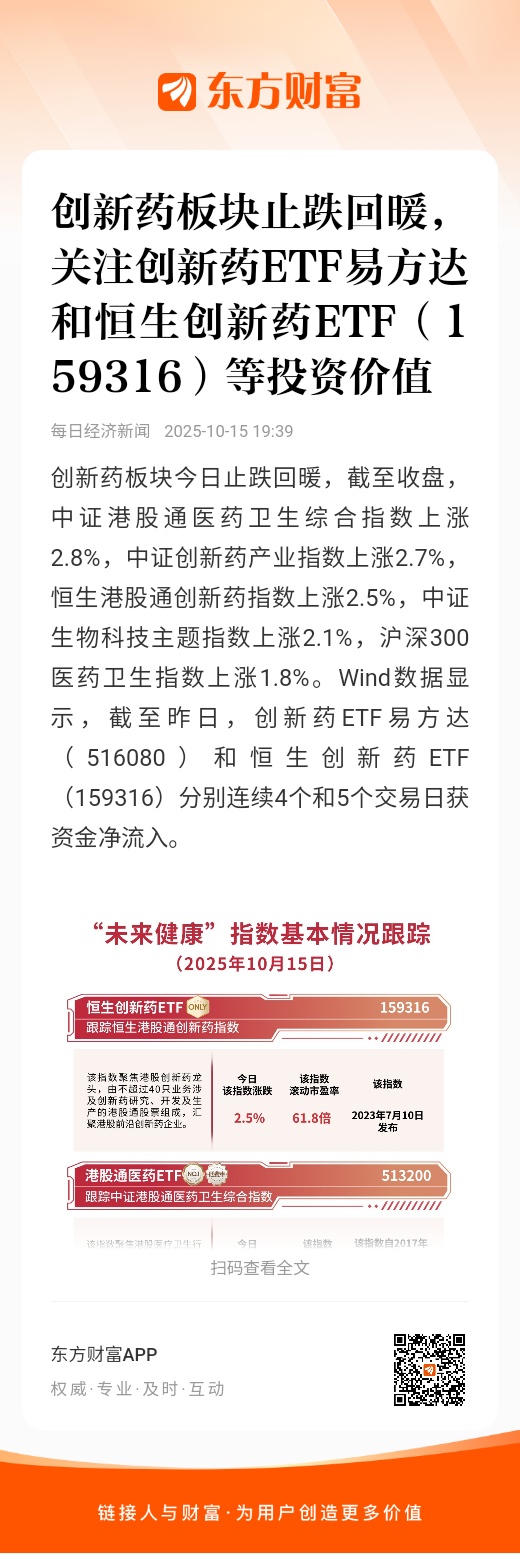 创新药板块今日止跌回暖,截至收盘,中证港股通医药卫生综合指数上涨2.8%,中证创新药产业指数上涨2.7%,恒生港股通创新药指数上涨2.5%,中证生物科技主题指数上涨2.1%,沪深300医药卫生指数上涨1.8%。Wind数据显示,截至昨日,创新药ETF易方达(516080)和恒生创新药ETF(159316)分别连续4个和5个交易日获资金净流入。