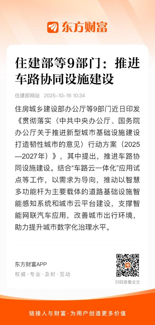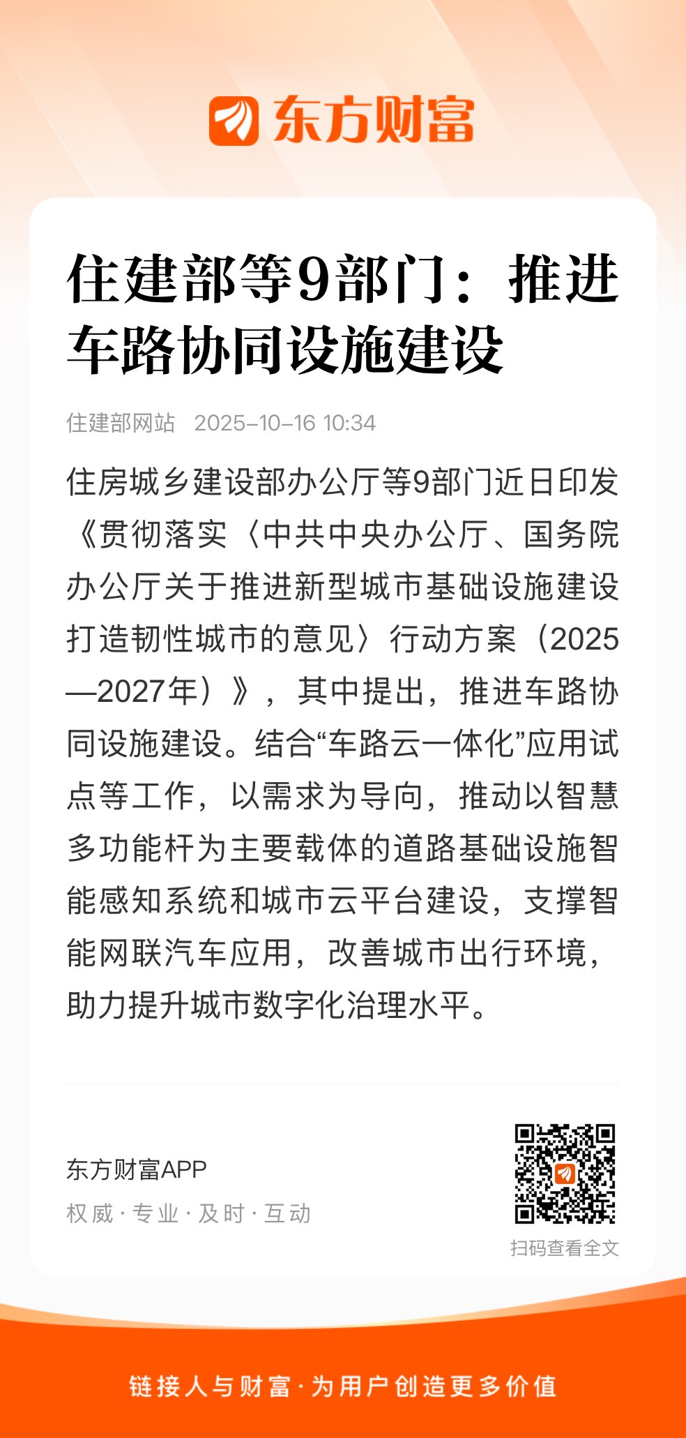 住房城乡建设部办公厅等9部门近日印发《贯彻落实〈中共中央办公厅、国务院办公厅关于推进新型城市基础设施建设打造韧性城市的意见〉行动方案(2025—2027年)》,其中提出,推进车路协同设施建设。结合“车路云一体化”应用试点等工作,以需求为导向,推动以智慧多功能杆为主要载体的道路基础设施智能感知系统和城市云平台建设,支撑智能网联汽车应用,改善城市出行环境,助力提升城市数字化治理水平。