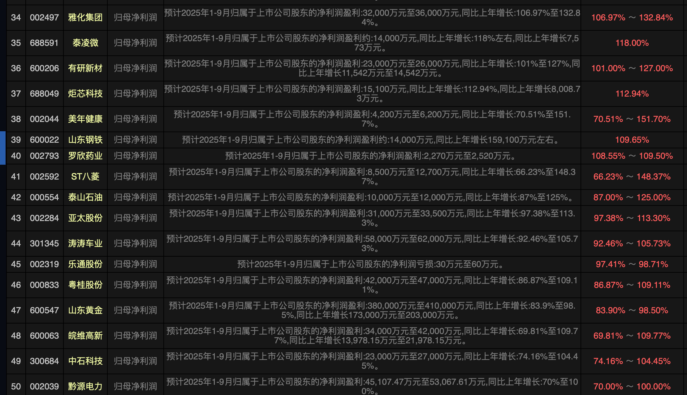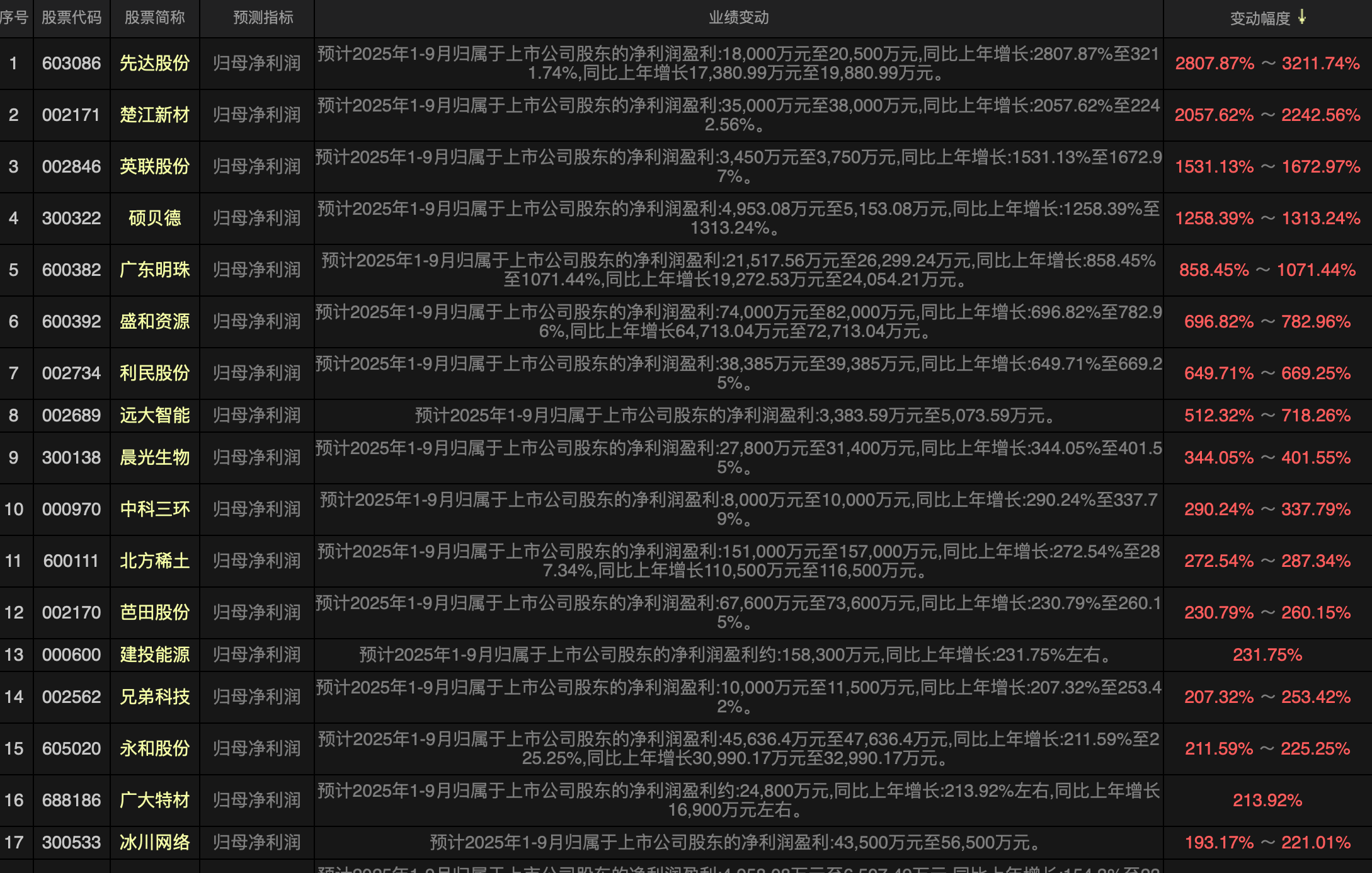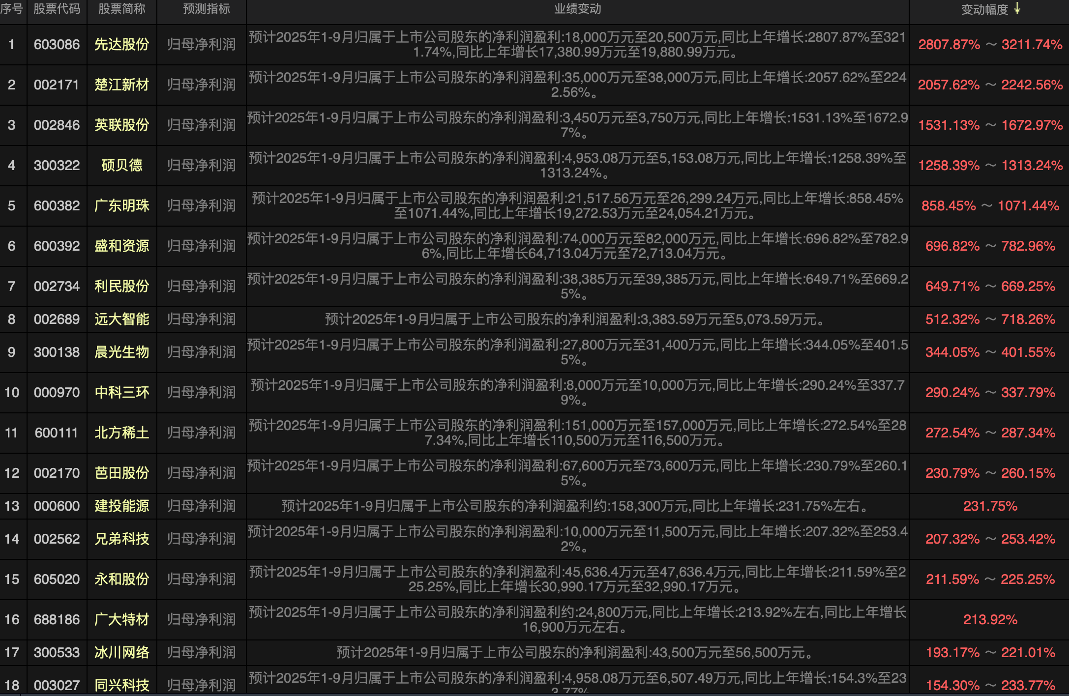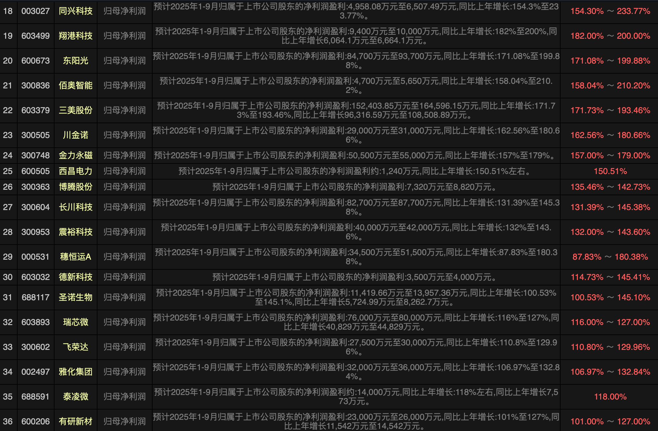 还有一部分业绩增长比较好的而且金额也比较高的是出海股,以涛涛车业为例,三季度业绩继续加速净利润增长100%左右达到6亿元左右,根据目前的公布的进出口数据看,这样的公司应该是很多的,出海股还是值得期待的。$三美股份(SH603379)$$北方稀土(SH600111)$$金力永磁(SZ300748)$