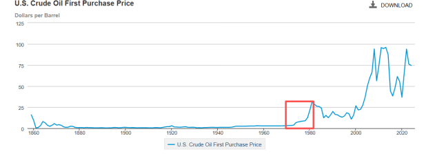 从1970年到1979年,国际油价从1.2美元/桶飙升至40美元,十年间累计涨幅高达约32倍。