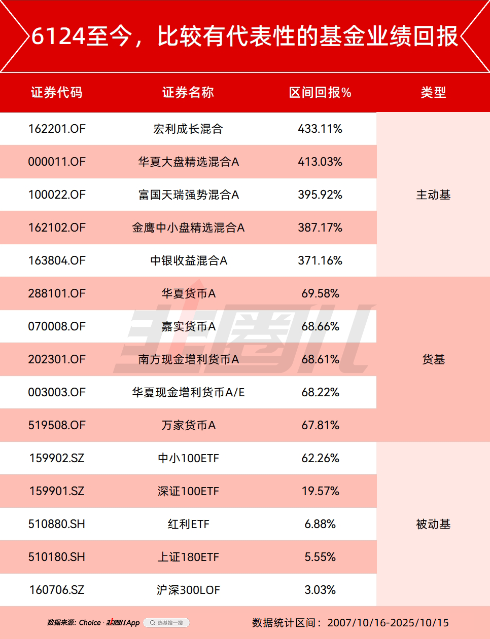 我统计了6124点之前成立的基金从2007/10/16到昨天的收益,挑选了主动基、货基、被动基收益最好的各5只基金放在这里。