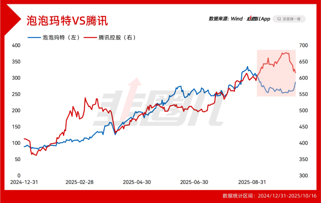 对比泡泡玛特和腾讯这段时间的股价走势,明显能看出来是反着走的。