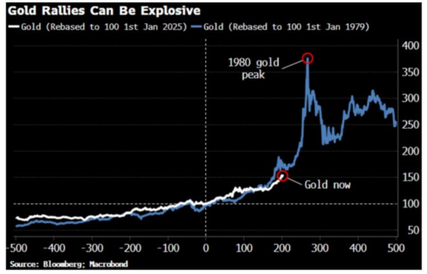 外媒把今年黄金的价格除以10之后和1979年的黄金涨幅做对比,发现走势非常贴合,刻舟求剑的话,明年1月份黄金要涨到8500美元。