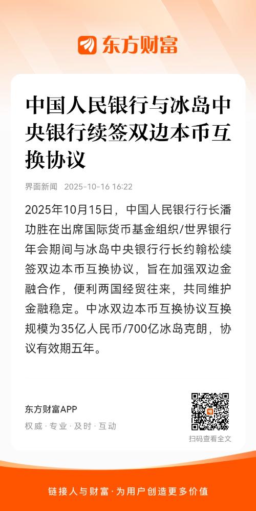 2025年10月15日,中国人民银行行长潘功胜在出席国际货币基金组织/世界银行年会期间与冰岛中央银行行长约翰松续签双边本币互换协议,旨在加强双边金融合作,便利两国经贸往来,共同维护金融稳定。中冰双边本币互换协议互换规模为35亿人民币/700亿冰岛克朗,协议有效期五年。