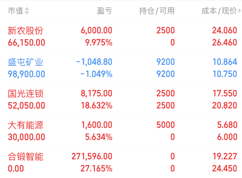 5.新农股份: 绿色农药概念及农化制品板块整体活跃,市场关注度提升。目前呈现强势涨停突破形态,已实现3连板,封单来看是标准三板组。由于是突破性涨停,短期无明显压力,继续持有,享受龙头溢价。明日关注封单变化,若封单维持巨大可继续持有
