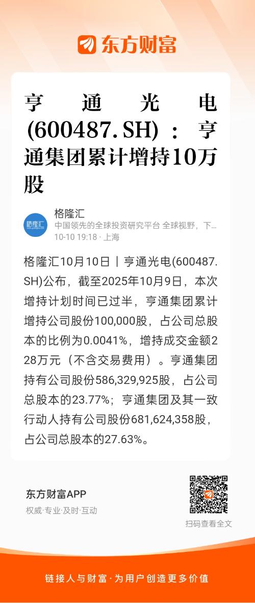 格隆汇10月10日丨亨通光电(600487.SH)公布,截至2025年10月9日,本次增持计划时间已过半,亨通集团累计增持公司股份100,000股,占公司总股本的比例为0.0041%,增持成交金额228万元(不含交易费用)。亨通集团持有公司股份586,329,925股,占公司总股本的23.77%;亨通集团及其一致行动人持有公司股份681,624,358股,占公司总股本的27.63%。