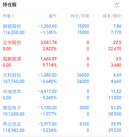 今日持仓及操作:进雅创电子养元饮品,加苍文科股份; 出:中油资本立华股份国新能源
