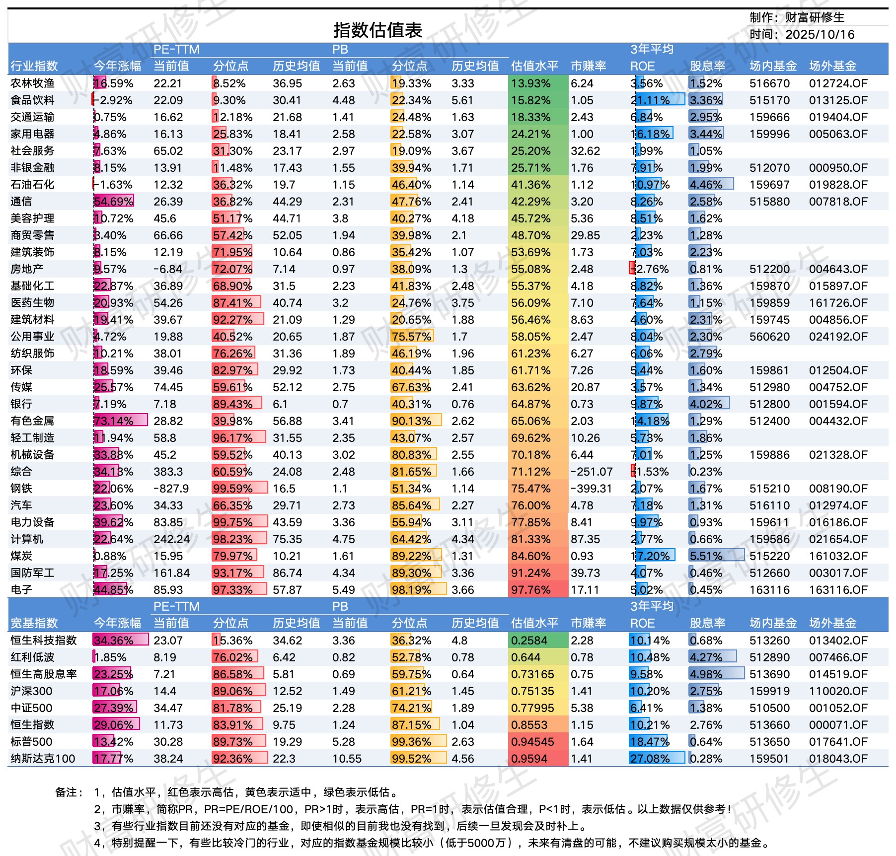 指数估值表 2025/10/16