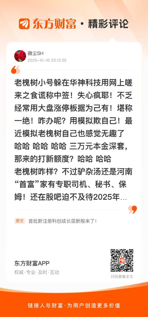 周知,转发//@微尘SH : 老槐树小号躲在华神科技用网上嗟来之食谎称中签!失心疯耶!不乏经常用大盘涨停板据为己有!堪称一绝!咋办呢?用模拟欺自己!最近模拟老槐树自己也感觉无趣了 哈哈 哈哈 哈哈 三万元本金深套,那来的打新额度?哈哈 哈哈 老槐树咋样?不过驴杂汤还是河南“首富”家有专职司机、秘书、保姆!还在股吧迫不及待2025年暨展望来年工作报告!哈哈 哈哈 咋想滴!脑髓鞘不会脱落了?