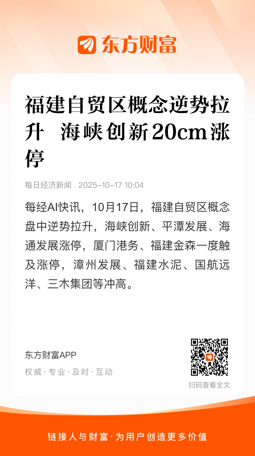 每经AI快讯,10月17日,福建自贸区概念盘中逆势拉升,海峡创新、平潭发展、海通发展涨停,厦门港务、福建金森一度触及涨停,漳州发展、福建水泥、国航远洋、三木集团等冲高。