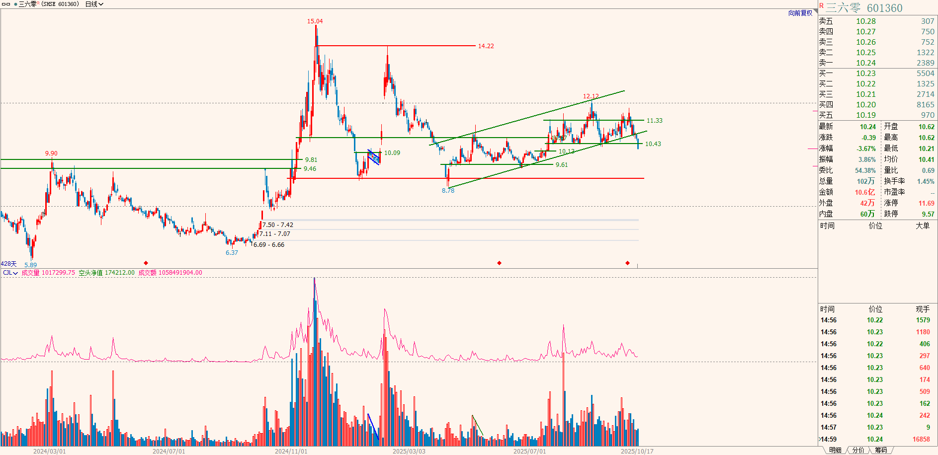 当前股价跌破了通道下边界,短线单止损。对于接下来的行情关注两个技术位;10.13