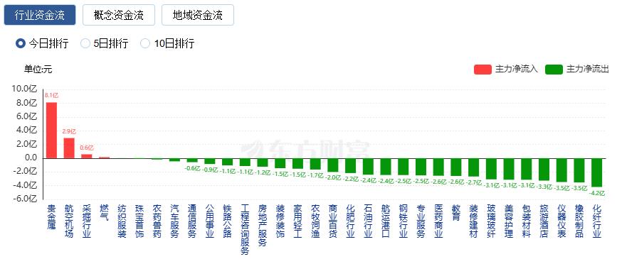 行业资金方面,截至收盘,贵金属、航空机场、采掘行业等净流入排名靠前,其中贵金属净流入8.10亿。