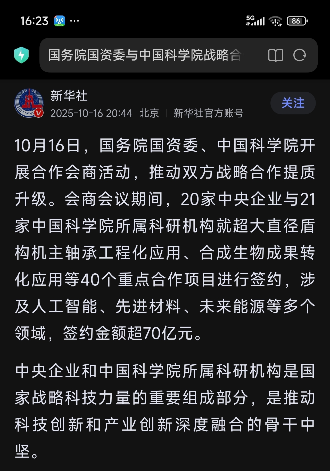 2025年10月16日,国资委、中科院和20余家企业签约超70亿
