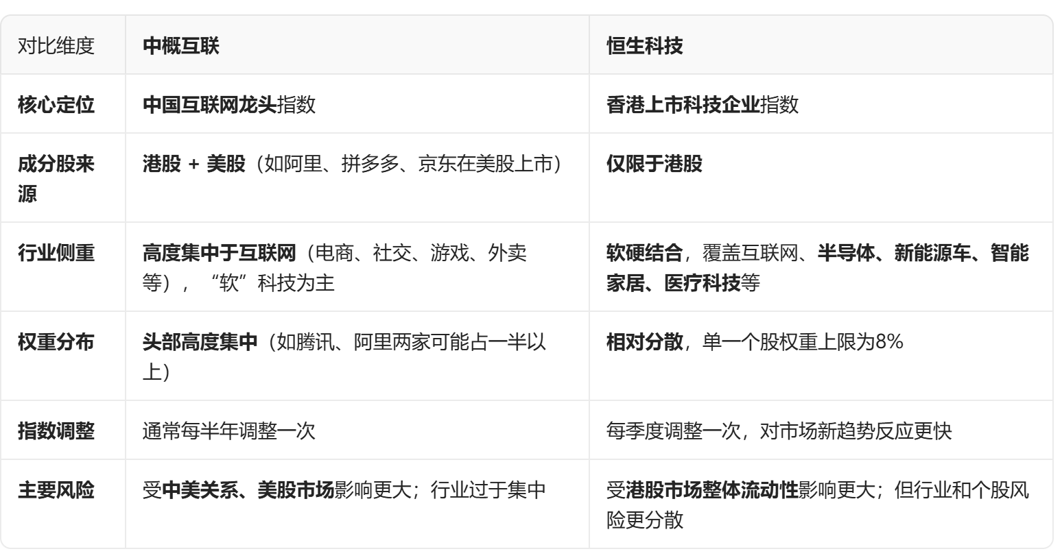 如果你极度看好中国互联网巨头的长期价值和反弹弹性,能承受较高波动,首选中概互联。因为它更纯粹,当互联网行业景气度回升时,它的上涨动力可能更强劲。但需要注意,其高集中度也意味着风险更高,如果头部公司出现问题,指数会受到较大冲击。