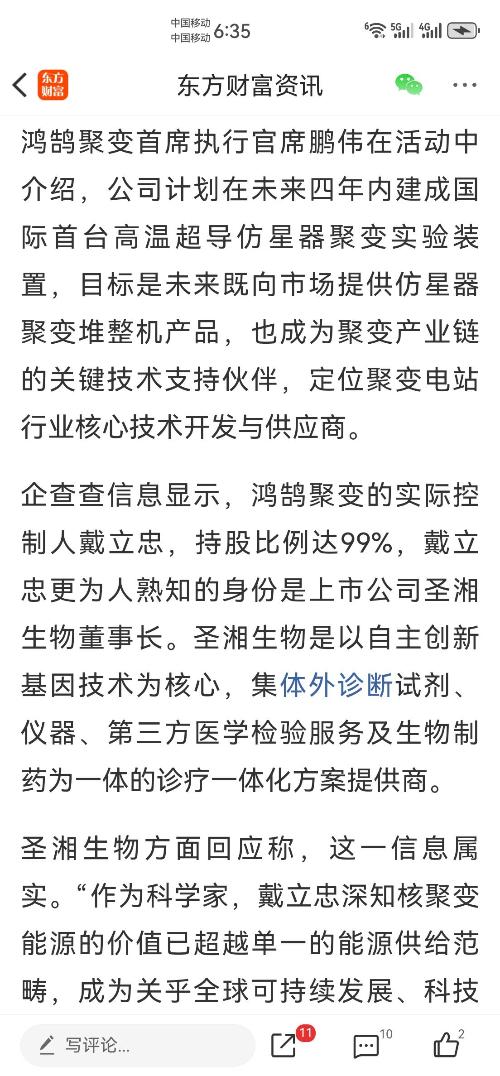 “戴立忠希望能为这个领域的世界级科学家与工程师创新创业搭平台、引资源、打基础。目前,鸿鹄聚变与上海交大的战略合作进展顺利,上海市及相关部委将其纳入了总体规划,作为重点项目重点扶持。”圣湘生物方面表示。