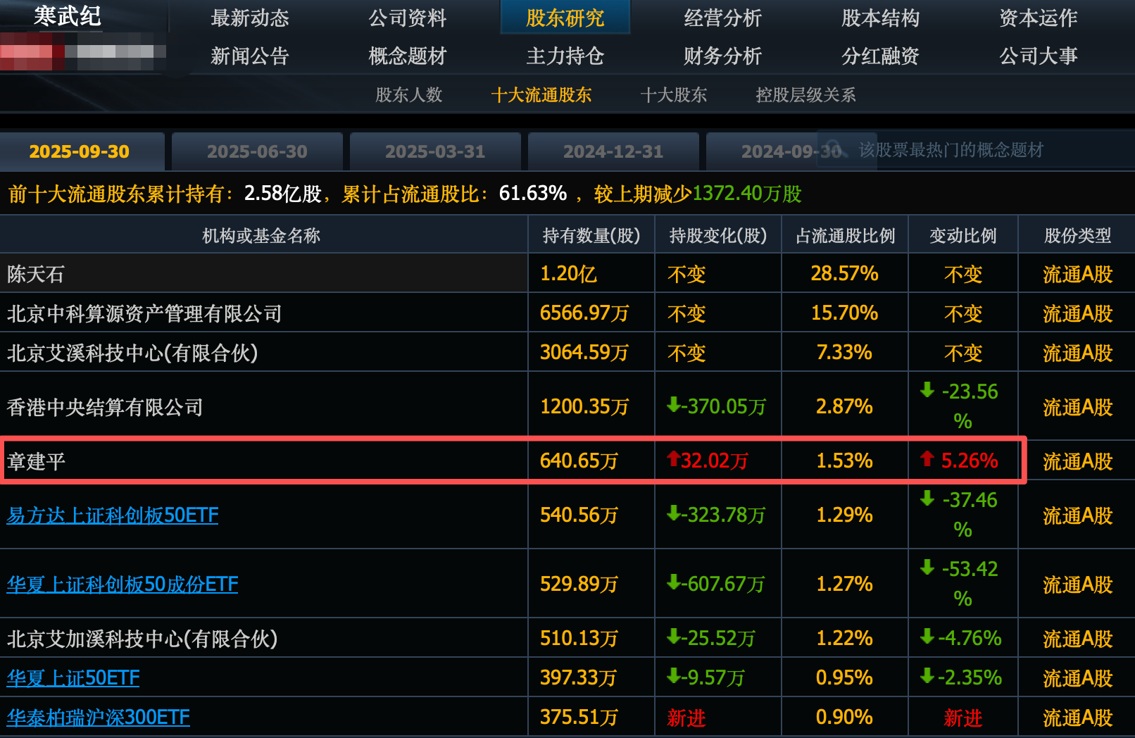 今天晚上又有很多公司公布了业绩,但其中有一个公司非常有意思,他就是芯片龙头寒武纪,根据最新的股东数据看,牛散章建平又加仓了。