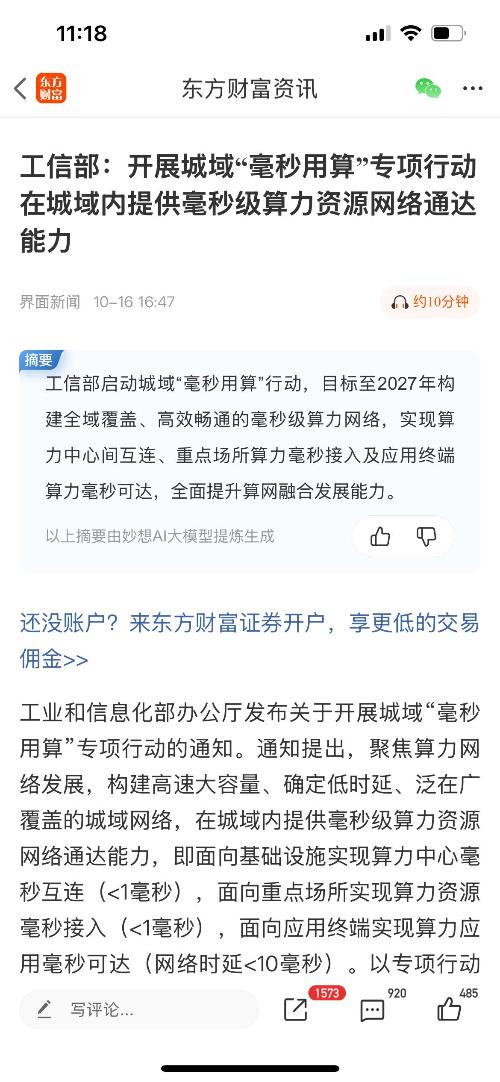 工业和信息化部办公厅发布关于开展城域“毫秒用算”专项行动的通知。通知提出,聚焦算力网络发展,构建高速大容量、确定低时延、泛在广覆盖的城域网络,在城域内提供毫秒级算力资源网络通达能力,即面向基础设施实现算力中心毫秒互连(<1毫秒),面向重点场所实现算力资源毫秒接入(<1毫秒),面向应用终端实现算力应用毫秒可达(网络时延<10毫秒)。以专项行动为牵引,带动产业各方聚焦畅通毫秒用算通道,在全国范围内梯次推进毫秒用算网络建设,到2027年基本形成全域覆盖、高效畅通的城域毫秒用算网络能力体系。