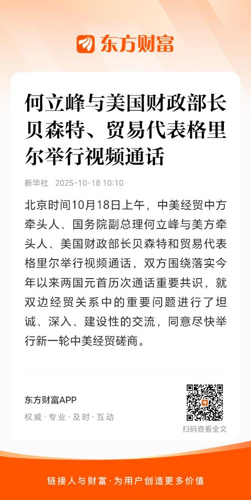 北京时间10月18日上午,中美经贸中方牵头人、国务院副总理何立峰与美方牵头人、美国财政部长贝森特和贸易代表格里尔举行视频通话,双方围绕落实今年以来两国元首历次通话重要共识,就双边经贸关系中的重要问题进行了坦诚、深入、建设性的交流,同意尽快举行新一轮中美经贸磋商。