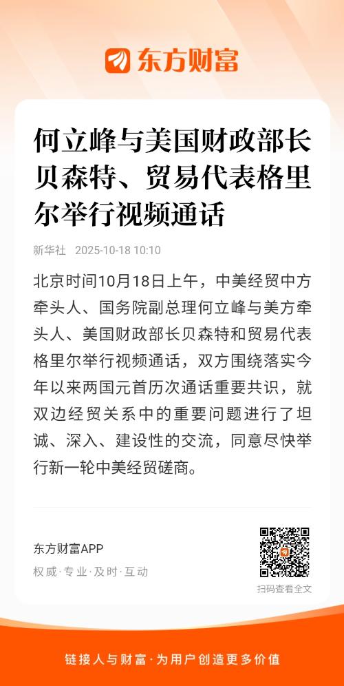 北京时间10月18日上午,中美经贸中方牵头人、国务院副总理何立峰与美方牵头人、美国财政部长贝森特和贸易代表格里尔举行视频通话,双方围绕落实今年以来两国元首历次通话重要共识,就双边经贸关系中的重要问题进行了坦诚、深入、建设性的交流,同意尽快举行新一轮中美经贸磋商。
