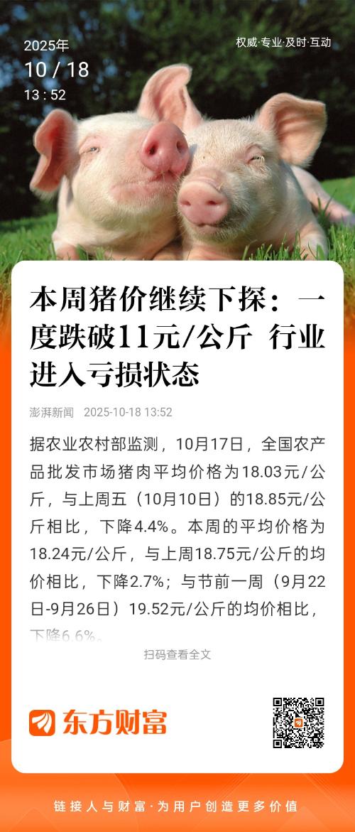据农业农村部监测,10月17日,全国农产品批发市场猪肉平均价格为18.03元/公斤,与上周五(10月10日)的18.85元/公斤相比,下降4.4%。本周的平均价格为18.24元/公斤,与上周18.75元/公斤的均价相比,下降2.7%;与节前一周(9月22日-9月26日)19.52元/公斤的均价相比,下降6.6%。