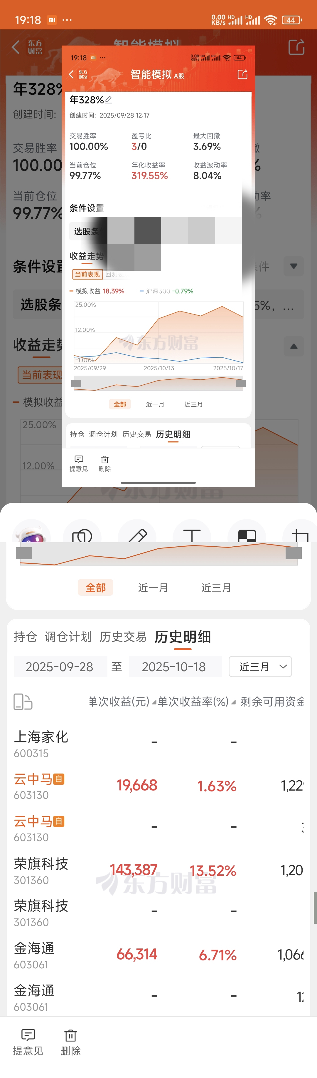 不断断优化策略,目前测试了半个月,胜率还是很高的,选出股票也很强,后面在进一步观察优化。