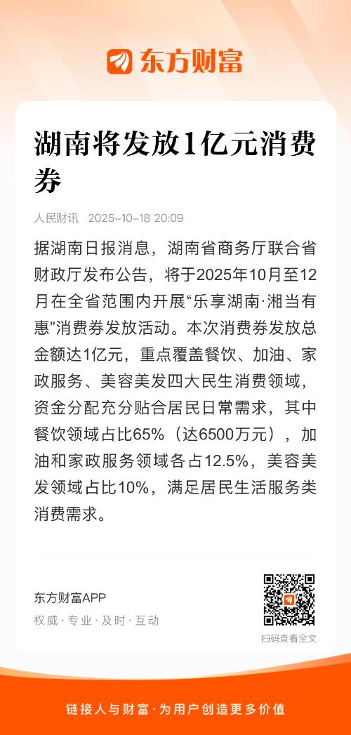 据湖南日报消息,湖南省商务厅联合省财政厅发布公告,将于2025年10月至12月在全省范围内开展“乐享湖南·湘当有惠”消费券发放活动。本次消费券发放总金额达1亿元,重点覆盖餐饮、加油、家政服务、美容美发四大民生消费领域,资金分配充分贴合居民日常需求,其中餐饮领域占比65%(达6500万元),加油和家政服务领域各占12.5%,美容美发领域占比10%,满足居民生活服务类消费需求。