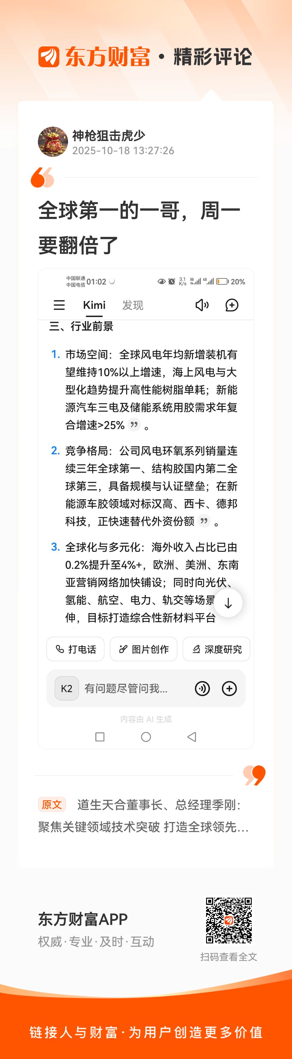 展望未来,季刚称,公司将紧跟产业发展趋势,聚焦关键领域技术突破,加强产业链上下游深度协同,在持续巩固风电叶片用材料领先地位的同时,积极拓展新业务,开拓全球市场,努力成长为全球领先的综合性新材料企业。