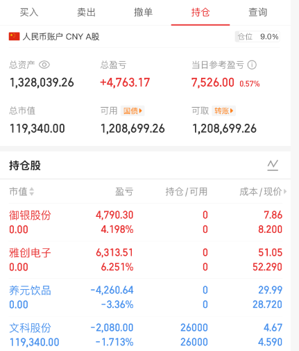 雅创电子:雅创昨天布局的理由是它作为电子元器件分销商,同时也有元器件设计、开发、服务一体的模式,很可能参与下周四的上海消费电子展,会提前3-5天反应在市场上。今早看集合竞价高开就知道稳了,盘中一度接近大涨10%,但我没卖到高点,跌下来后面拉到7%左右走的,大盘也在跳水,所以不敢继续格局,就先离场了。