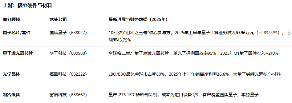 量子科技产业链分为上游核心硬件、中游系统集成、下游场景应用。高壁垒环节(芯片、光源、制冷机)龙头公司技术护城河显著。请看下图:
