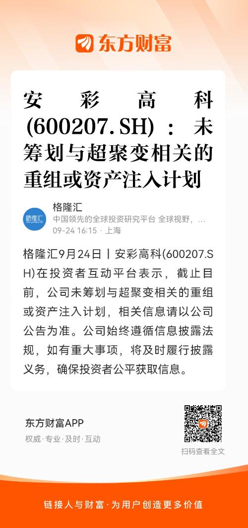 格隆汇9月24日丨安彩高科(600207.SH)在投资者互动平台表示,截止目前,公司未筹划与超聚变相关的重组或资产注入计划,相关信息请以公司公告为准。公司始终遵循信息披露法规,如有重大事项,将及时履行披露义务,确保投资者公平获取信息。