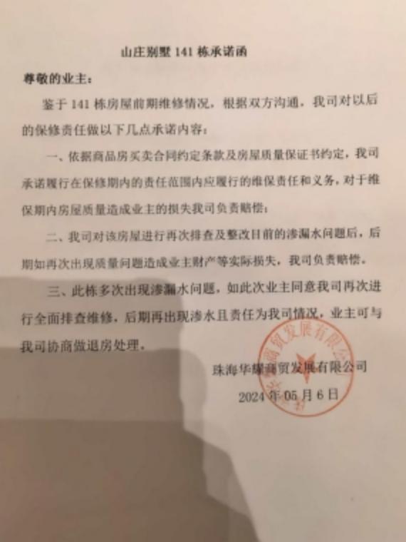 为此,开发商曾于2024年5月6日为李先生出具了一份承诺函,承诺函显示:“此栋多次出现渗漏水问题,如此次业主同意我司再次进行全面排查维修,后期再出现渗水且责任为我司情况,业主可与我司协商做退房处理。”
