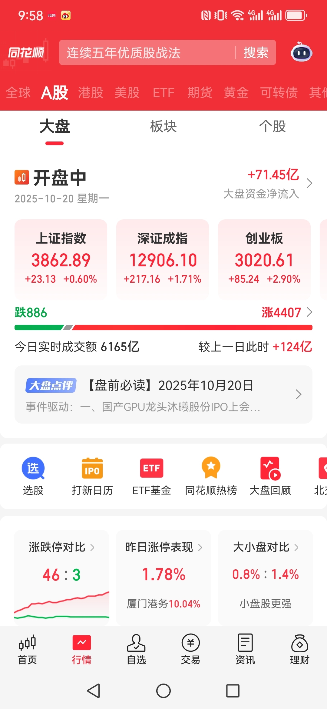 目前各大指数均处于上涨中,个股涨跌比例约为4:1,目前处于普涨中,板方面CPO概