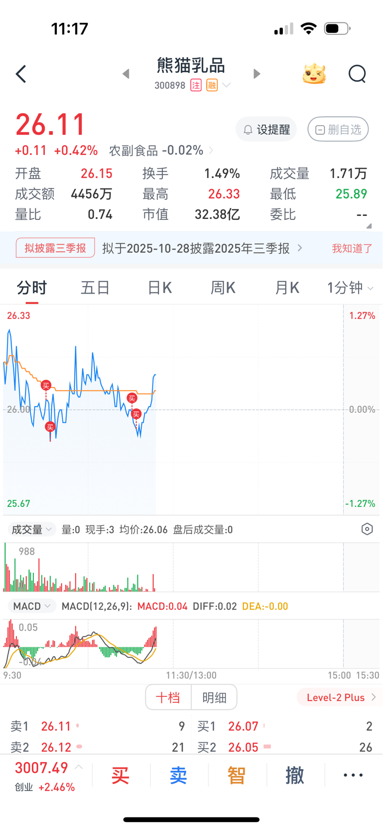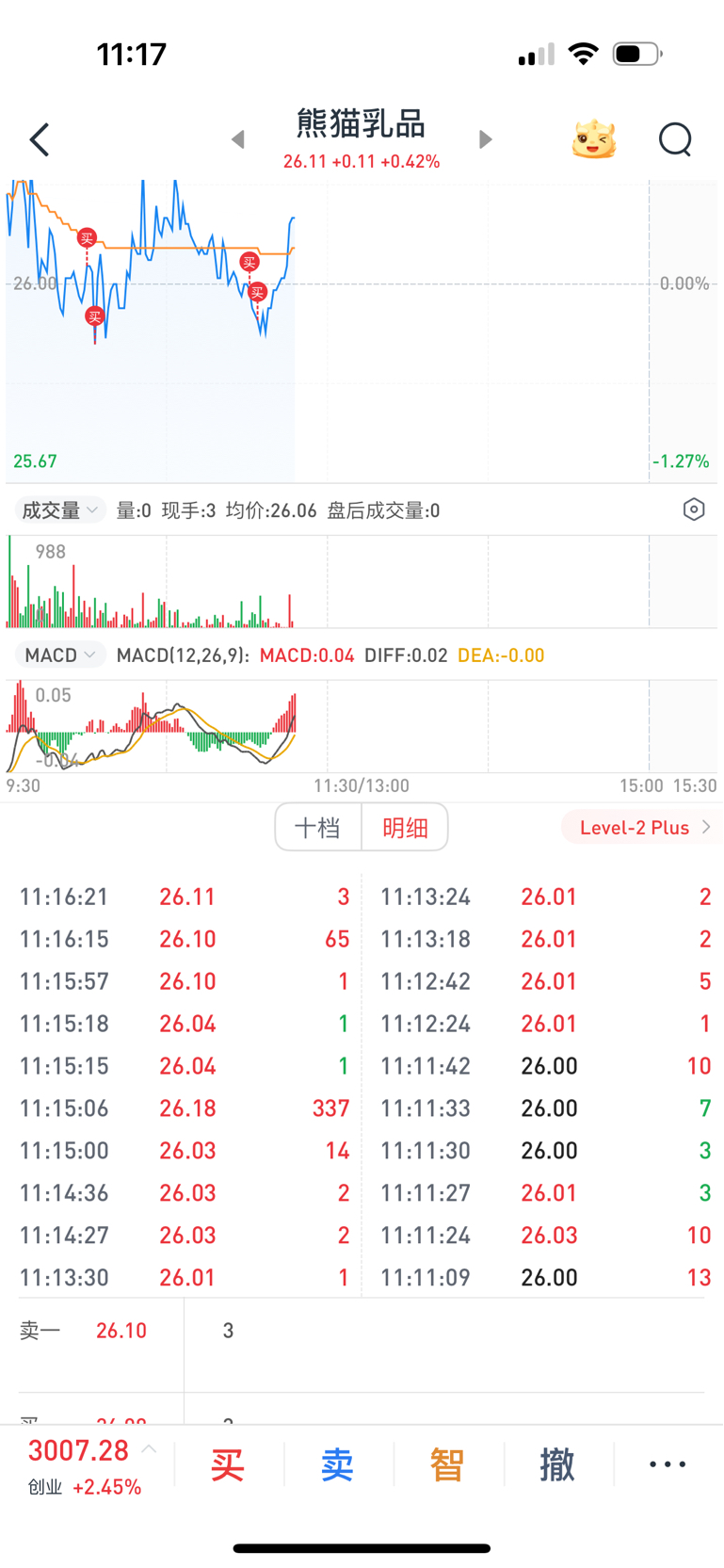 26.19是我的单,但是只吃到26.18,下跌趋势没量就是这样,只有耐心,但是会在急拉,也会急跌,如果你不知道为什么拉为什么跌,你就会觉得你是不是被量化盯上了?是不是就耍你的错觉,但其实都不是,只是因为没“量”而已,而你做的就是耐心等,放平心态~