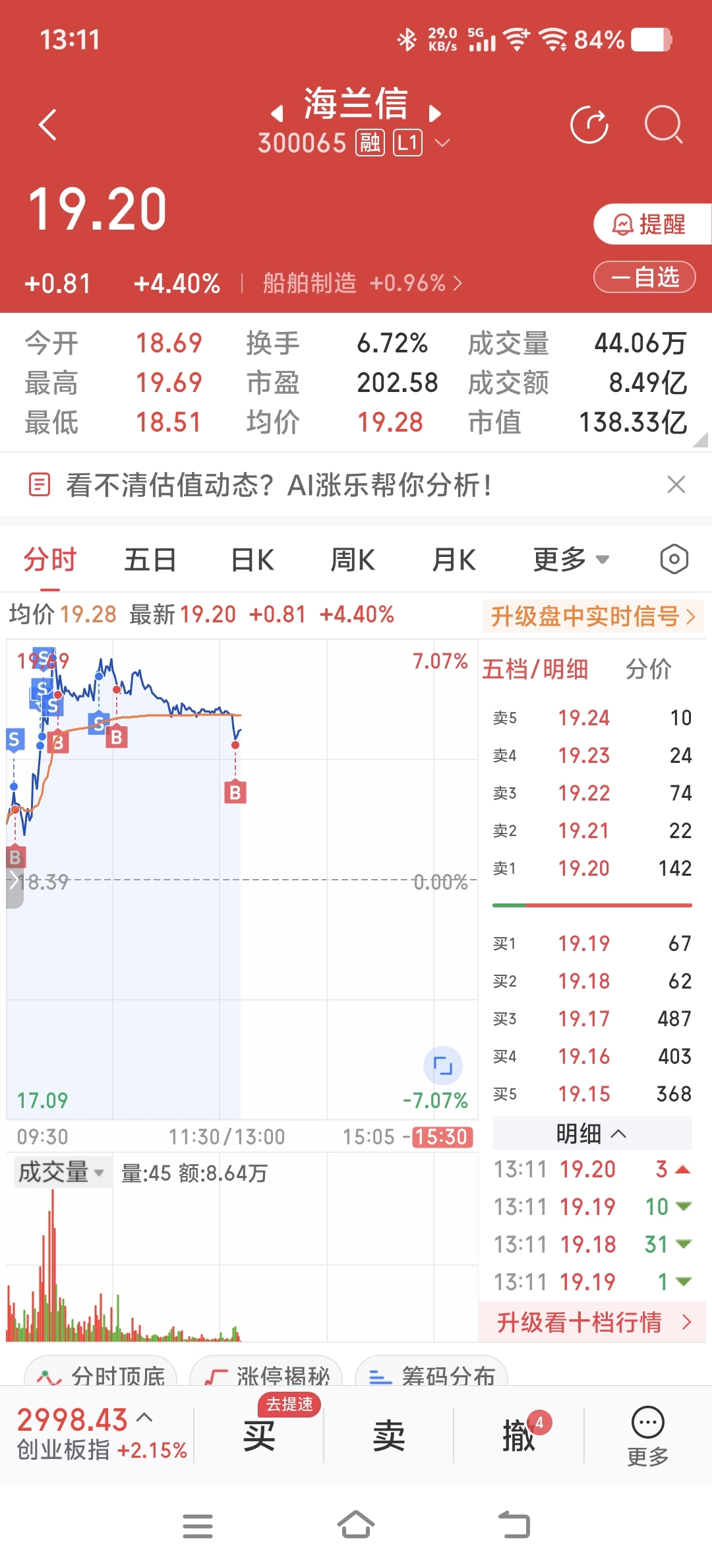 今天海兰信卖出额度还剩1笔,目前已接回3/5仓位。