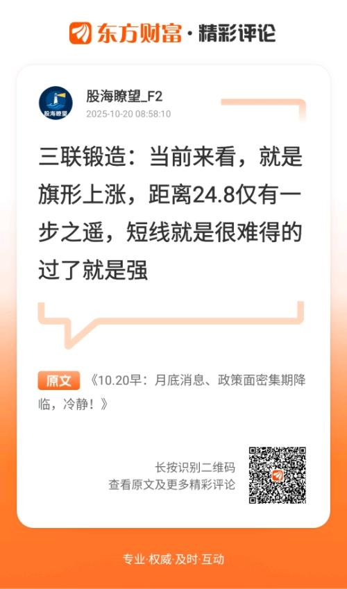 //@股海瞭望_F2 :三联锻造:当前来看,就是旗形上涨,距离24.8仅有一步之遥,短线就是很难得的过了就是强