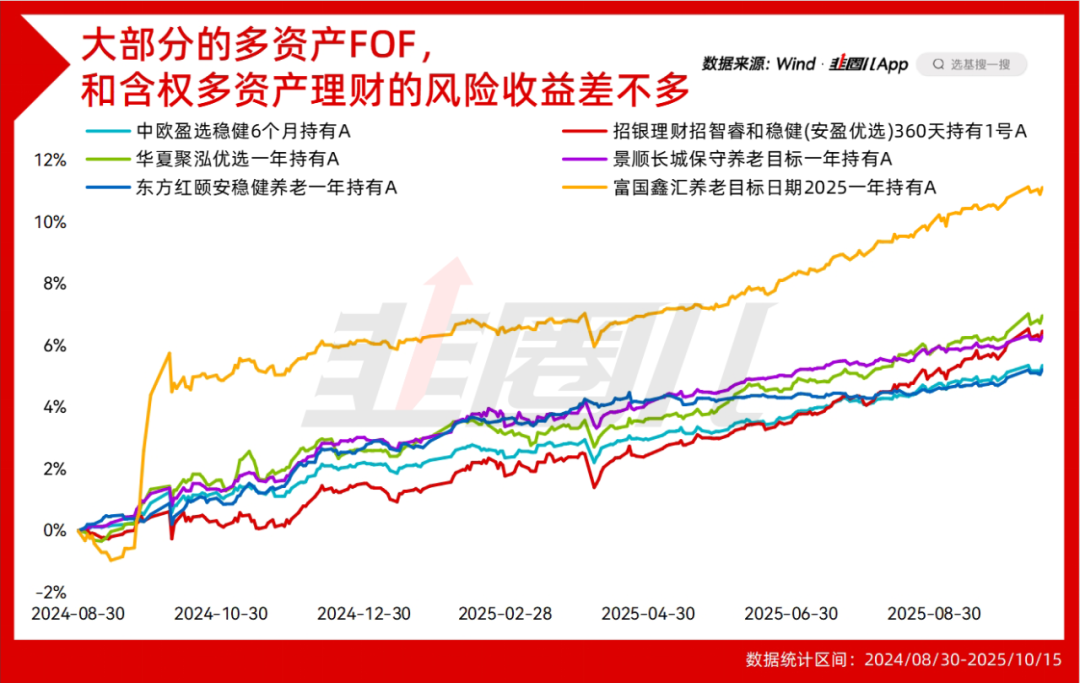事实上,如果从去年9月开始算,除了富国鑫汇在924有过一波明显的拉升之外,大部分时间内几只FOF在回报层面是很接近的,就是一个含权理财的收益水平。