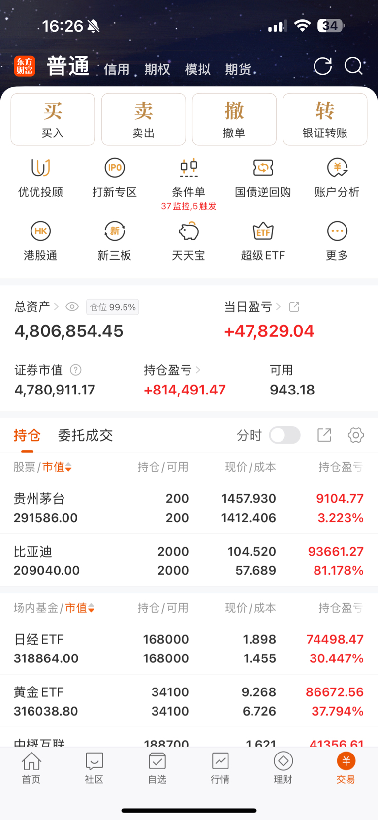 万日定投第160天,今日周定投德国ETF五千元,触发条件单5笔,买入4笔,卖出 1笔,今日收益: 4.7w