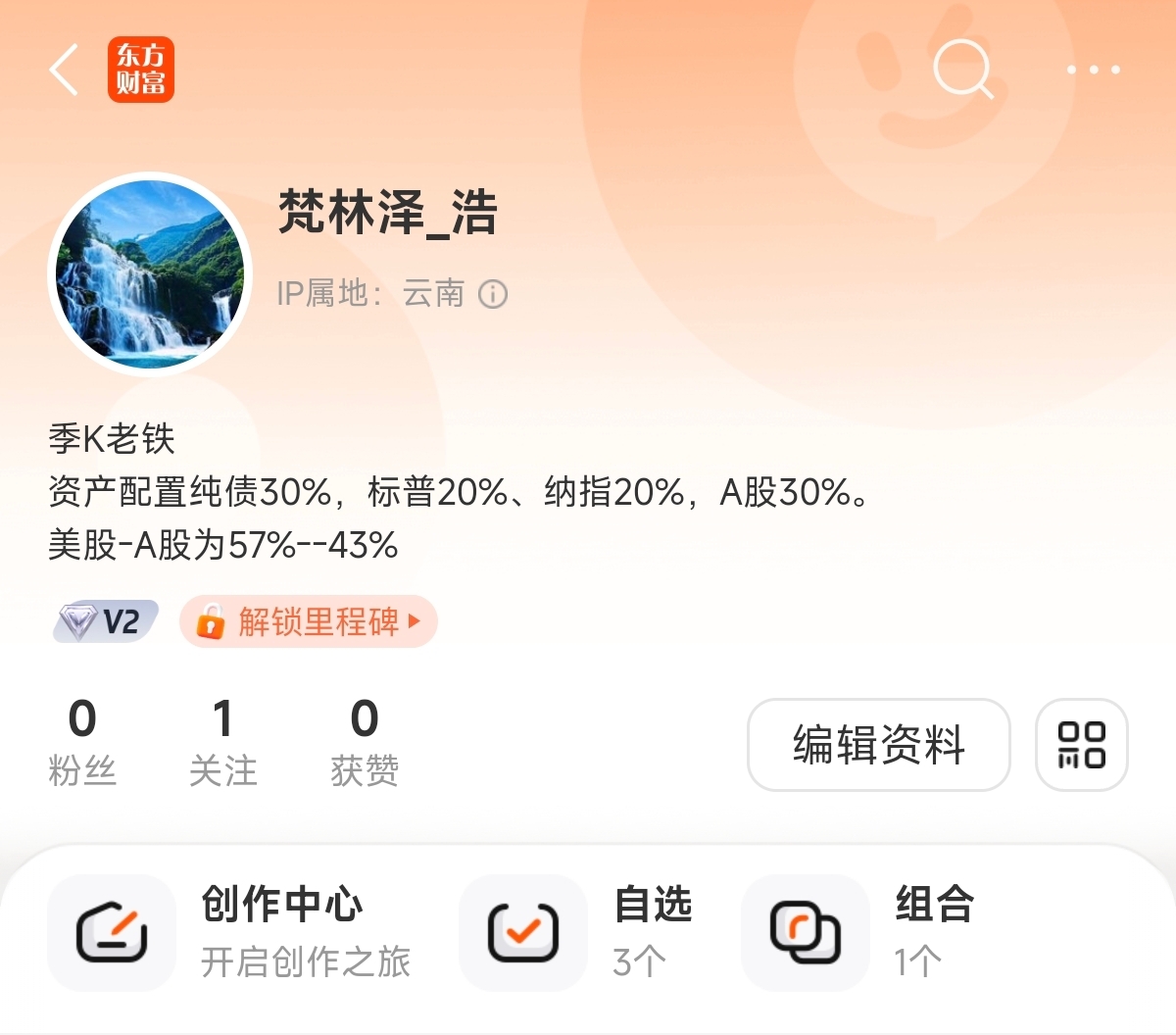 资产配置纯债30%,标普20%、纳指20%,A股30%。美股-A股为57%--4